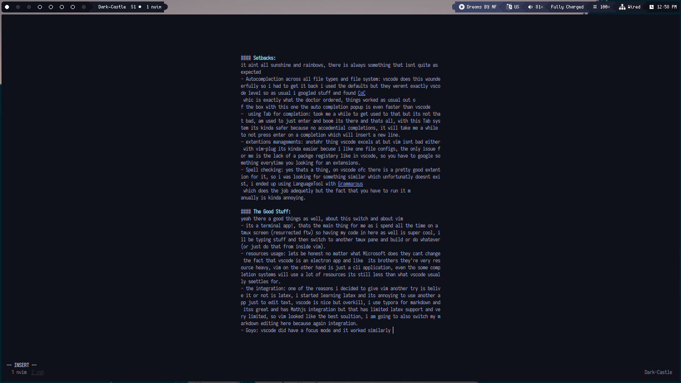 - Goyo: vscode did have a focus mode and it worked similarly, this allows me to completely focus on a file and not get distracted by other things like the cool NerdTree with icons or the tagBar.
